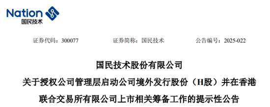A股上市公司、集成电路设计企业国民技术(300077.SZ)公告,公司于2025年4月16日召开董事会会议,审议通过了《关于授权公司管理层启动公司境外发行股份(H股)并在香港联合交易所有限公司上市相关筹备工作的议案》。