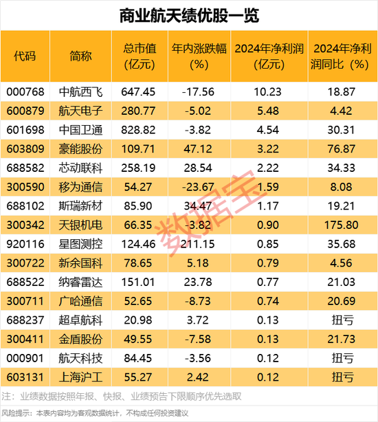 据证券时报·数据宝统计,商业航天概念股有近70只,年内股价平均上涨6.47%,星图测控的股价涨幅最高,年内累计上涨211.15%;龙溪股份、国光电气、豪能股份(维权)、鸿远电子的股价涨幅居前,均上涨超40%。