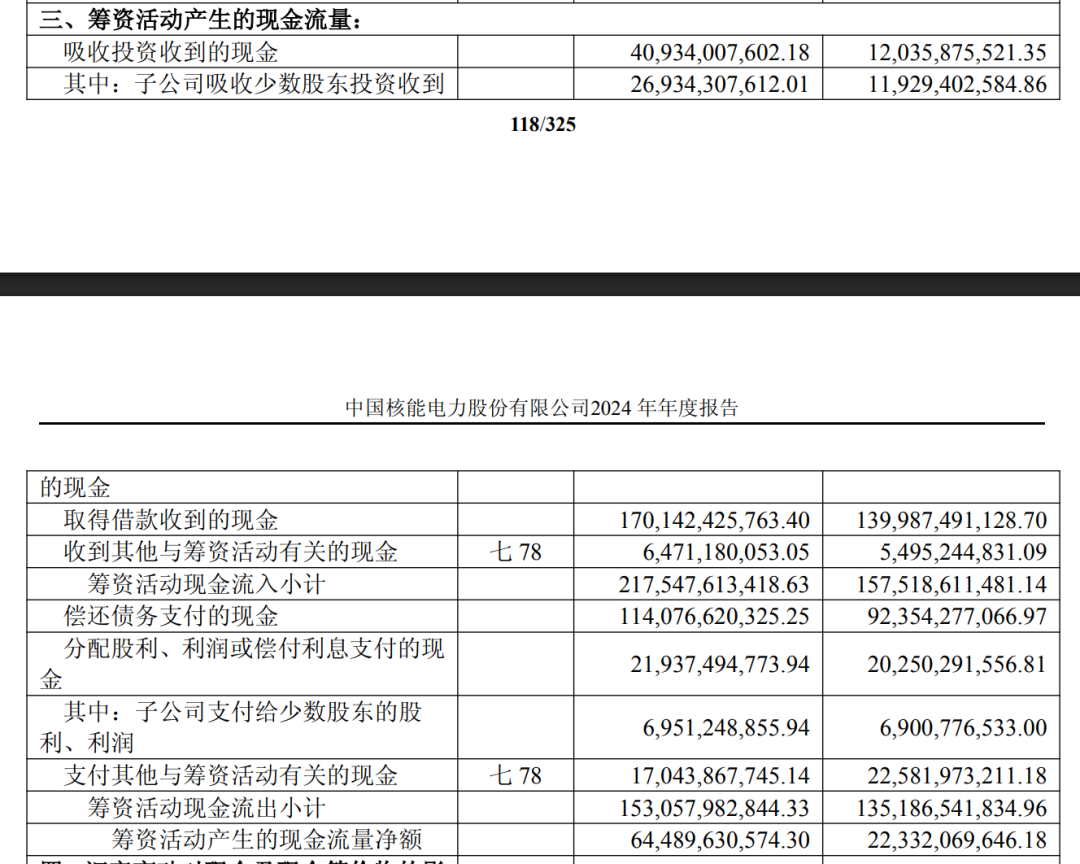 不过中国核电还没有现金流压力。虽然经营活动产生的现金流净额连续两年缩减,在2024年减少至407亿元,同比下滑了5.58%,投资活动产生的现金流净额也从-717亿元扩大为-949亿元,增幅为32.4%,但筹资能力强悍,筹资活动产生的现金流量净额,从2023年的223亿元上涨至2024年的645亿元,同比增长了188%。