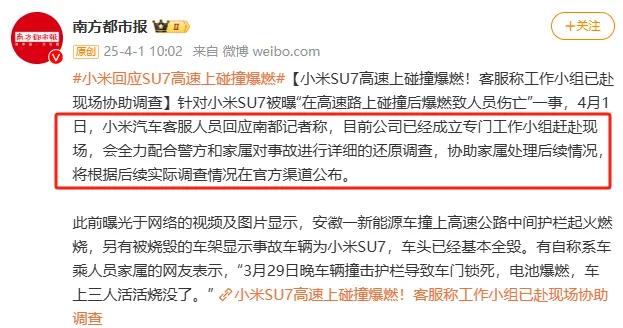 4月1日上午,小米汽车客服人员对媒体回应:目前公司已经成立专门工作小组赶赴现场,会全力配合警方和家属对事故进行详细的还原调查,协助家属处理后续情况,将根据后续实际调查情况在官方渠道公布。