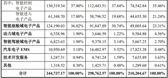报告期内,公司车身域电子产品销售收入占比分别为56.71%、57.32%和55.60%,智能座舱域电子产品销售收入占比分别为23.31%、30.74%和36.02%,二者合计占主营业务收入的比例分别为80.02%、88.06%和91.62%,是公司主营业务收入的主要来源。